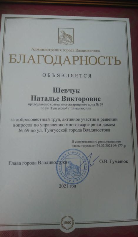 Награждение председателя МКД по ул.Тунгусская 69